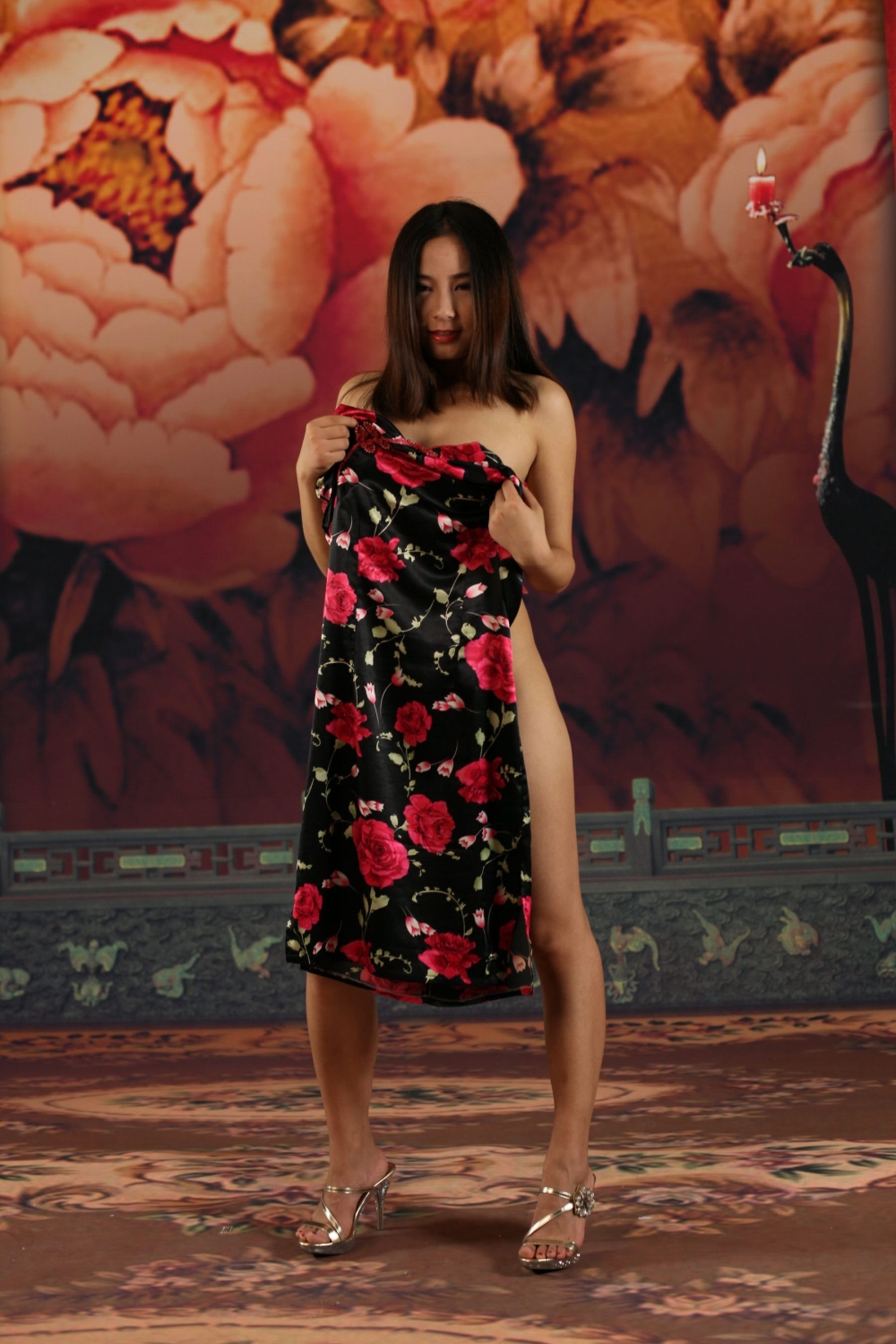 [チャイナドレスフェチ] ノーパンノーブラで着る!?生脚美脚につるつる光沢サテンチャイナドレスの着衣フェチエロ画像 38枚