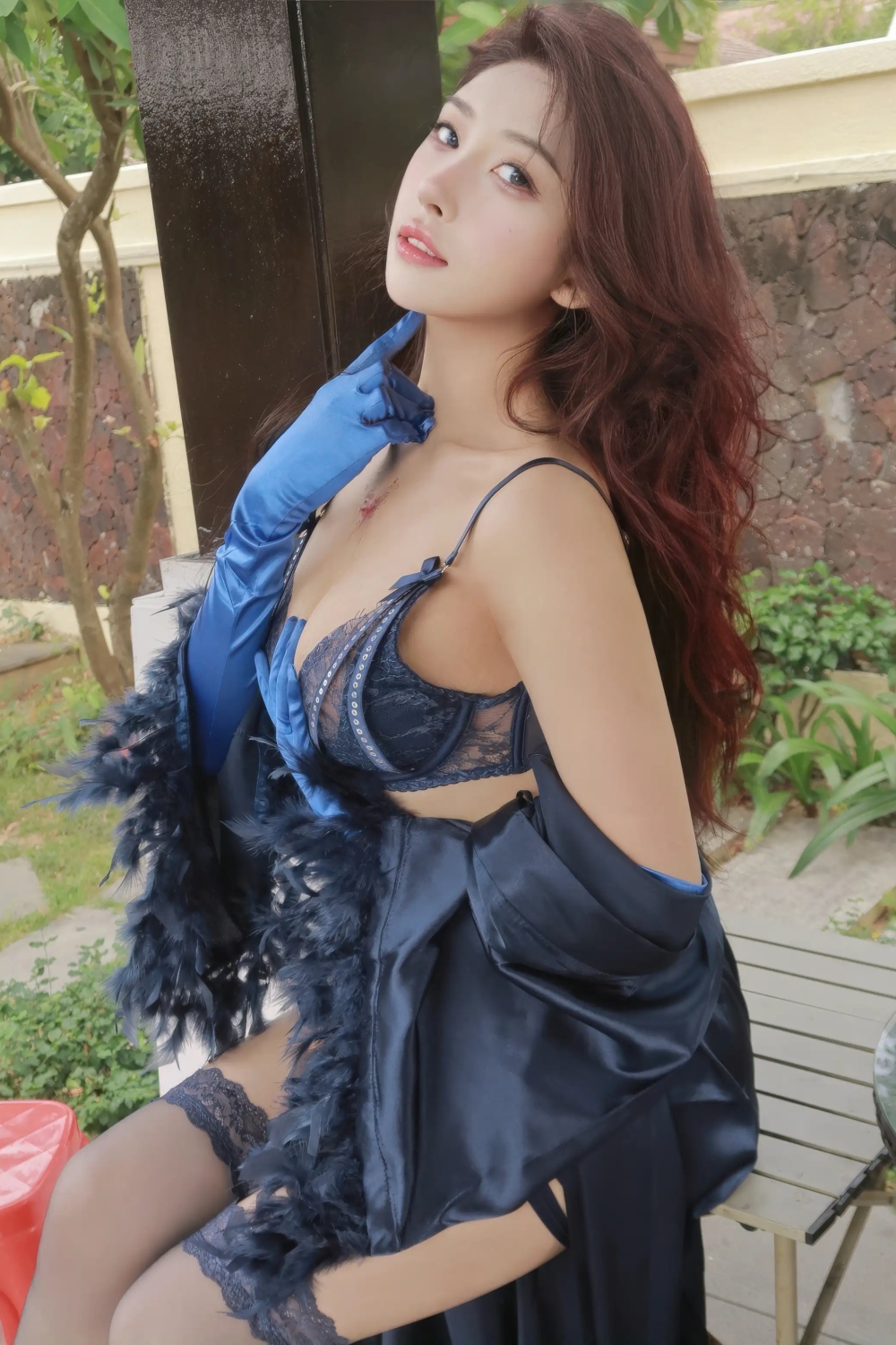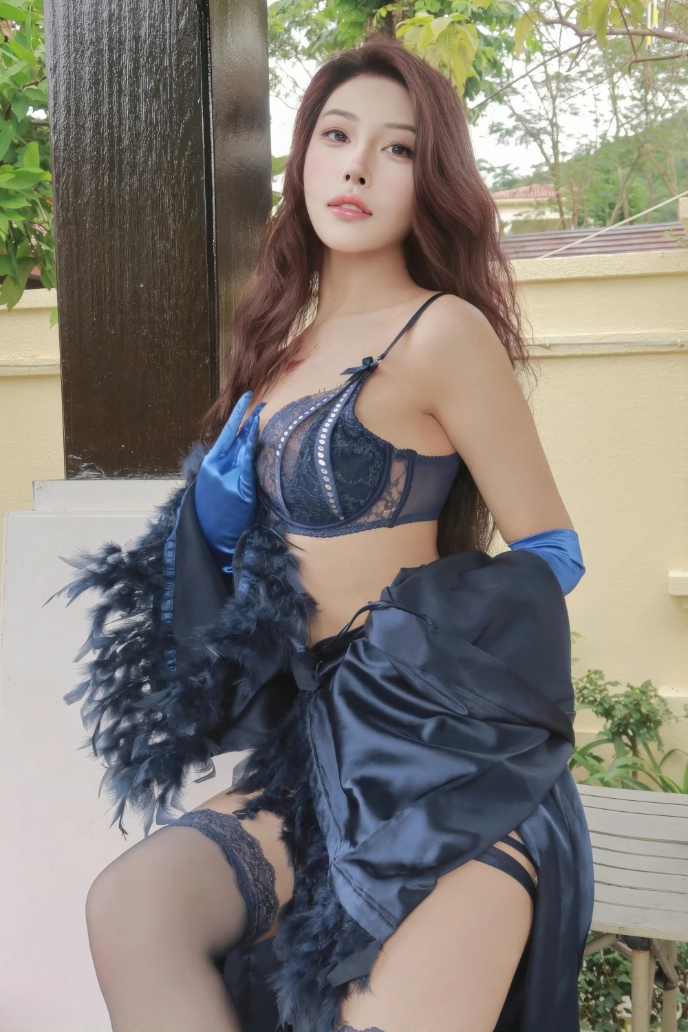 -ストッキング, ストッキング美脚, ハイヒール, 夏冰冰, 蓝色蕾丝内衣