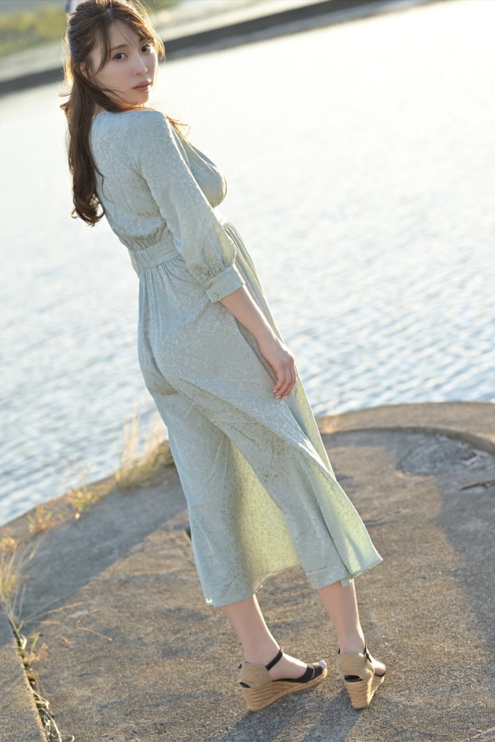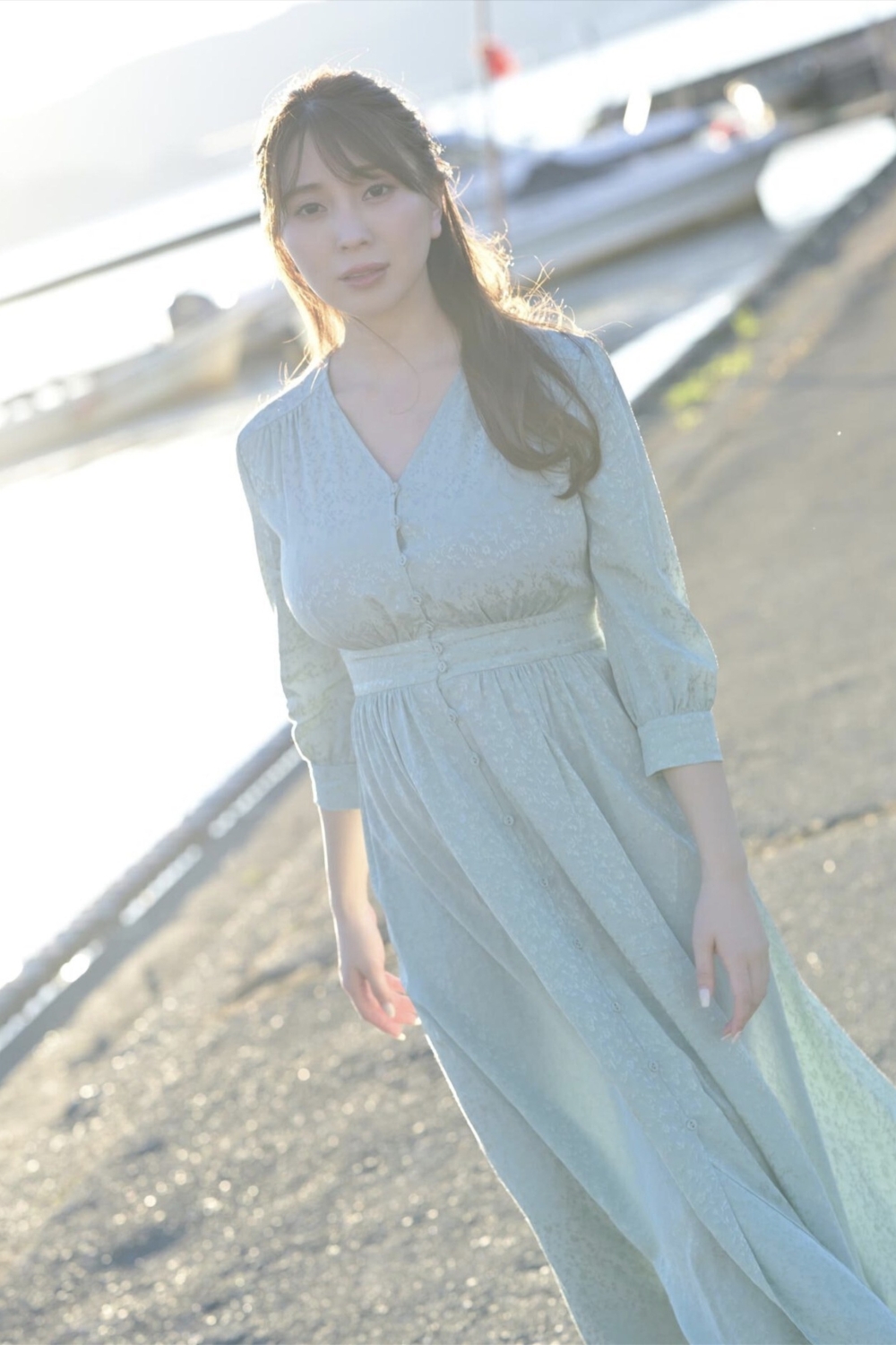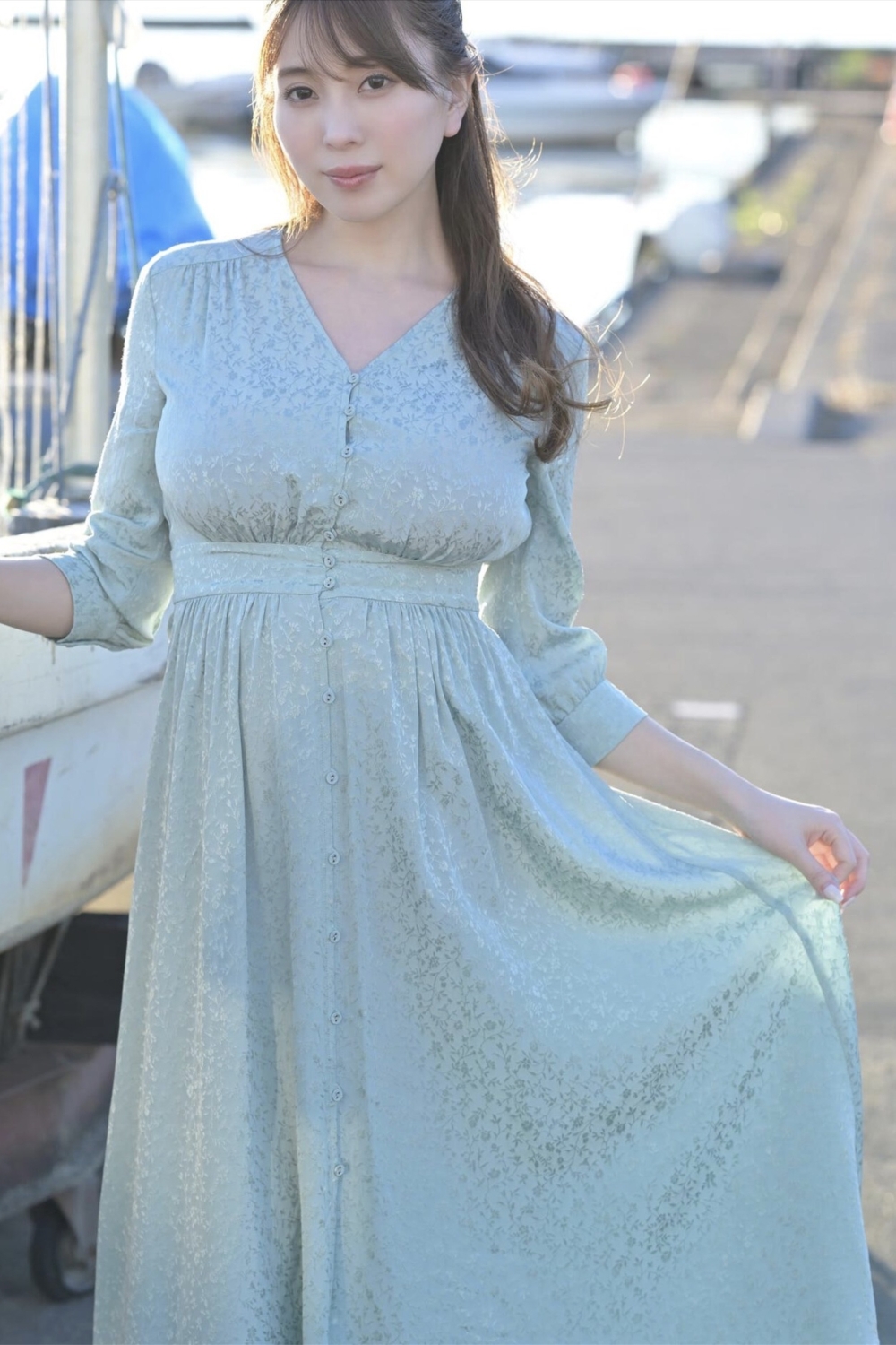[着衣フェチ] エロすぎるグラビアアイドル!?三十路になったGカップ美巨乳森咲智美のつるつる光沢サテンワンピースの着衣フェチエロ画像 15枚
