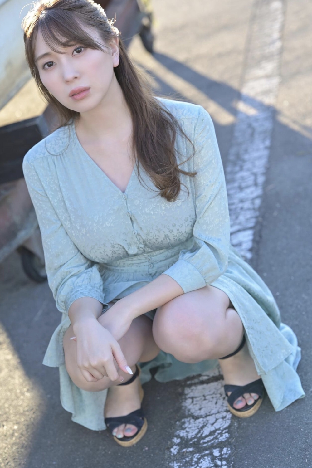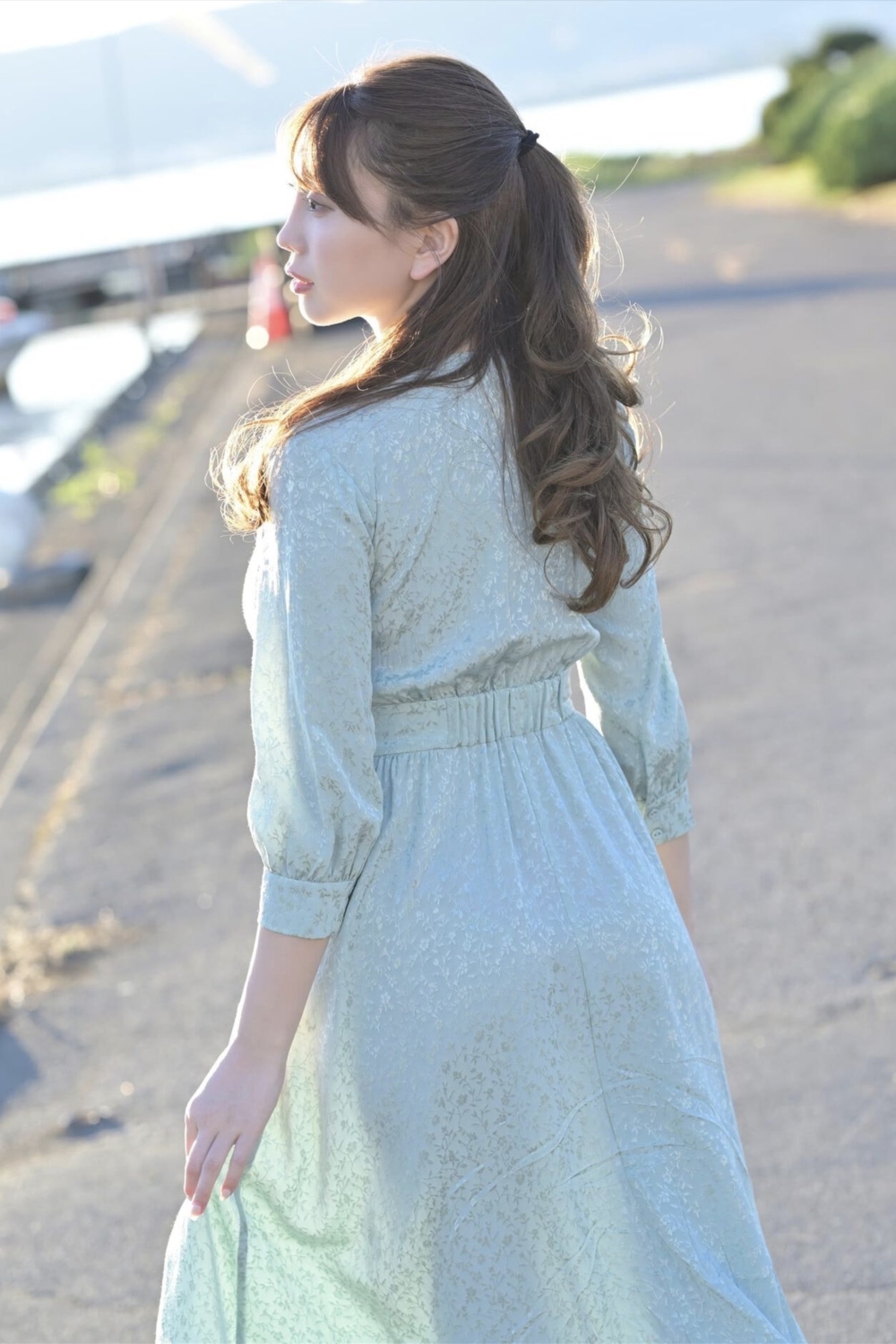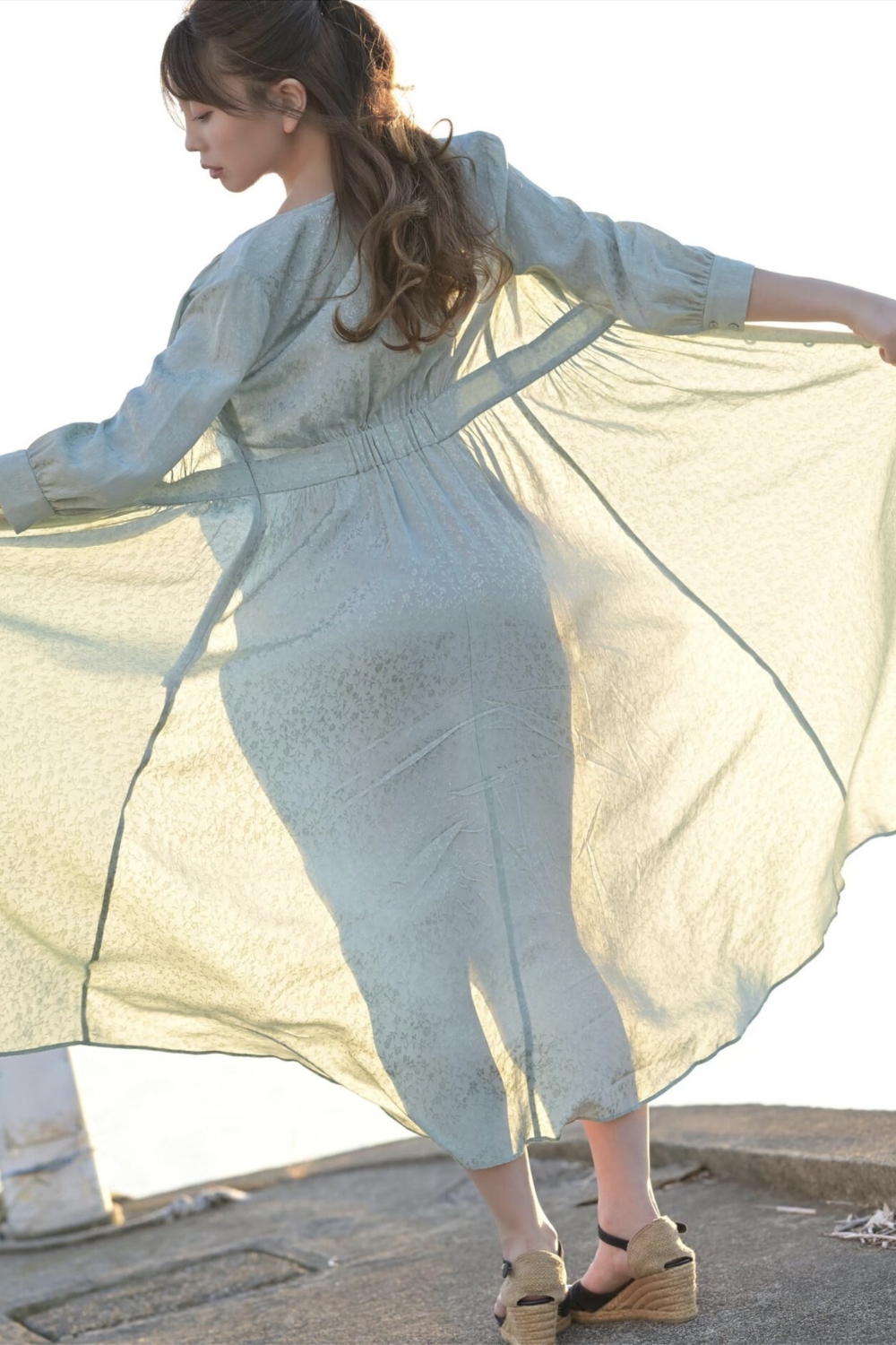 [着衣フェチ] エロすぎるグラビアアイドル!?三十路になったGカップ美巨乳森咲智美のつるつる光沢サテンワンピースの着衣フェチエロ画像 15枚